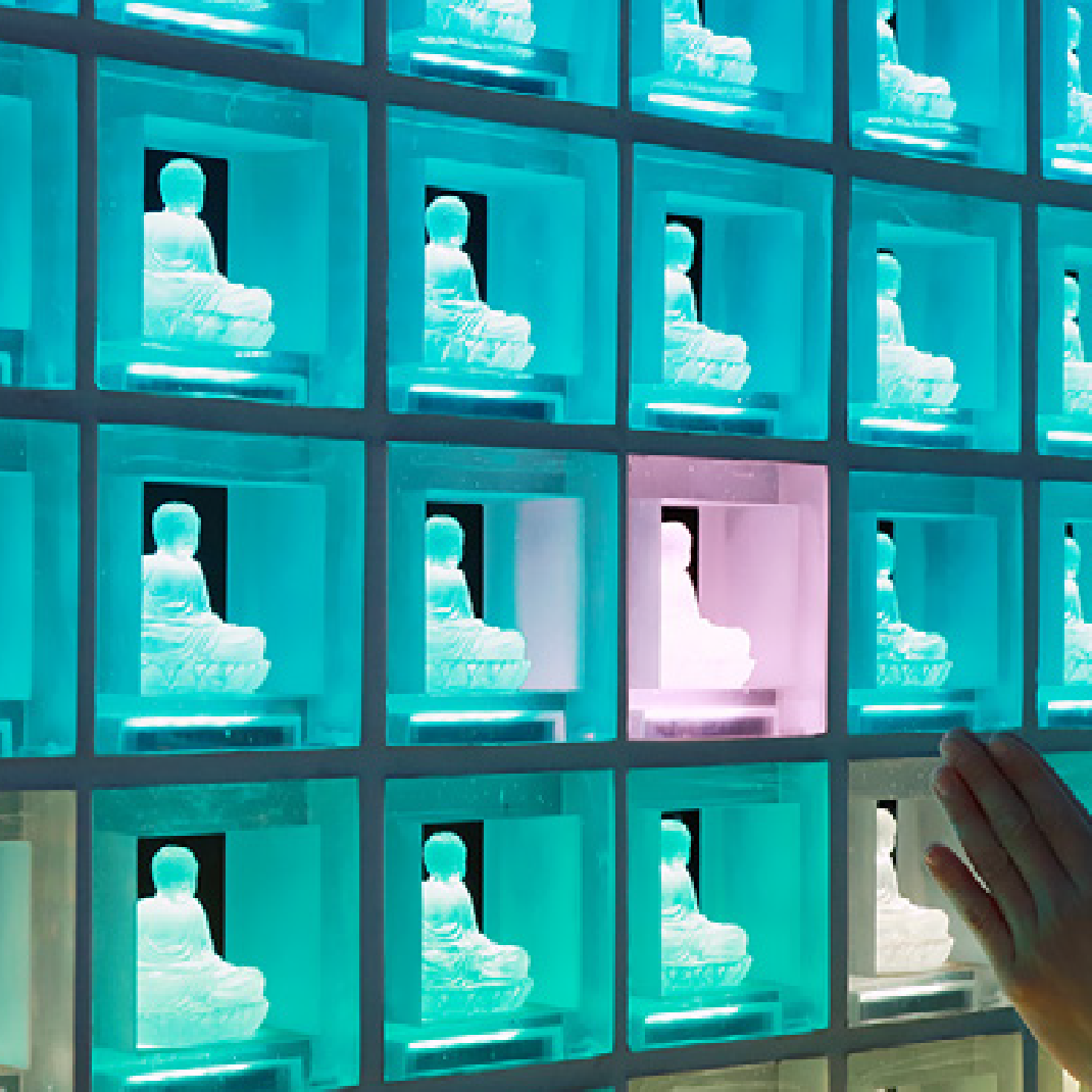 参道から殿内にいたる通路に段差をなくしたり、入り口の大きな扉は自動扉にしました。お年寄りや車いすの方には、雨天や強風の日でも安心してご参拝いただけます。このICカードによりお決めいただいた仏様(琉璃基)を点燈することができます。